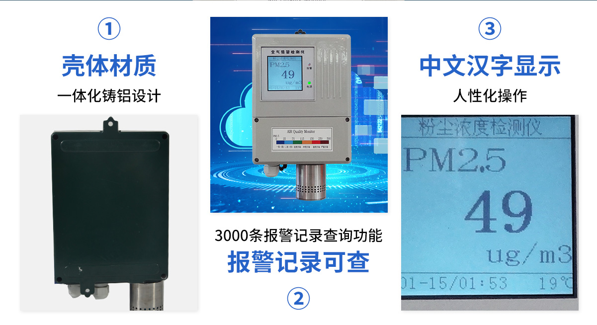 液晶顯示(PM1/PM2.5/PM10可同時顯示,也可單獨示);   溫度時間顯示功能