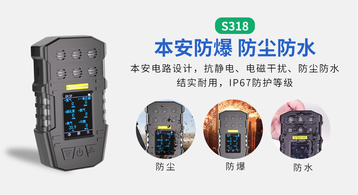 中安探測S318防爆型多氣體檢測報警器,可自由定制6種可燃氣體或有毒有害氣體傳感器進行檢測,防護等級IP67